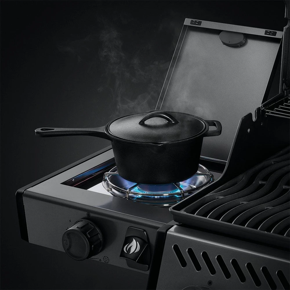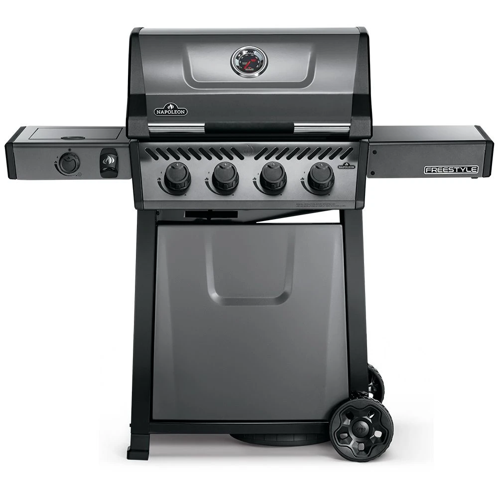 Napoleon F425DSBPGT-ECP Freestyle 425 Gas Grill on Cart with Side Range Burner, Propane serves up a high-quality grill that combines innovative tech with modern convenience features for a top-notch cooking experience. Napoleon’s signature JETFIRE ignition ensures an easy and reliable start up every time, and the iconic Wave cooking grids built from porcelain-coated cast iron provide the kind of sear marks every grillmaster loves to see. The side range burner offers a perfect platform for cooking up sides and sauces right on your grill for an all-in-one backyard hub.