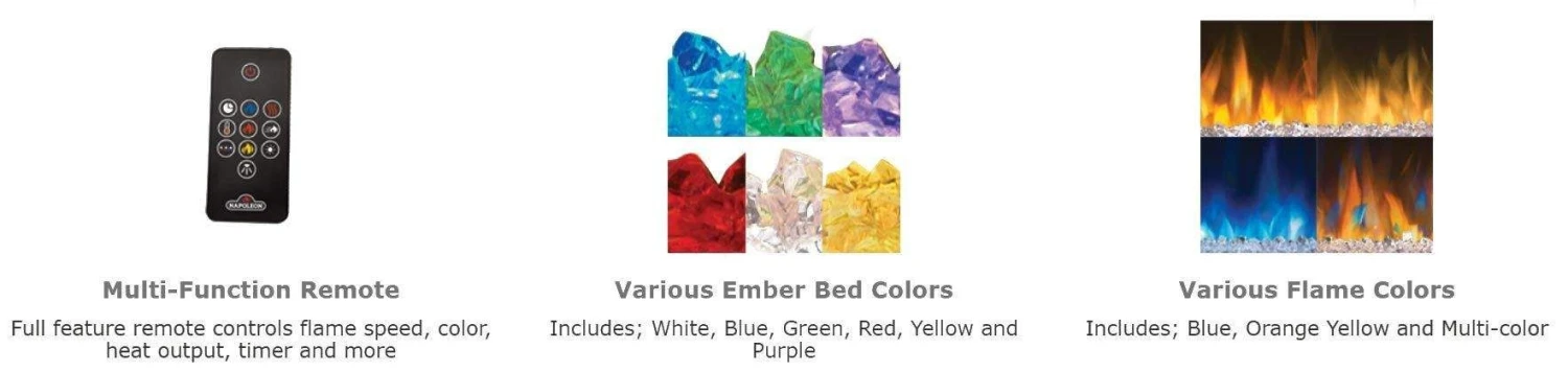 Napoleon NEFLxxCHS-1 Alluravision Slimline Linear Electric Fireplace provides a premium electric fireplace alternative for your perfect living space. Featuring an almost-frameless viewing area and unique flame colors, the Alluravision Series stands out from all others. Known for ease of use, this fireplace is simply plug and play–just hang on the wall and plug it in! For those who like a recessed fireplace, that option is available as well. Enjoy a slim depth fireplace that includes a Night Light effect to fit your viewing area preferences. The included remote makes it easy to set the mood (enjoy yellow, orange, blue or combined flame options), while the 5 different size options make it possible to complement any size of space. The Alluravision Fireplace offers stunning LED lighting, flame/heat adjustment, a blower-boost function and can be hard-wired. The Crystal Clear Cube Ember Bed helps finish off a unit that is sure to enhance the focal point of your room or home.