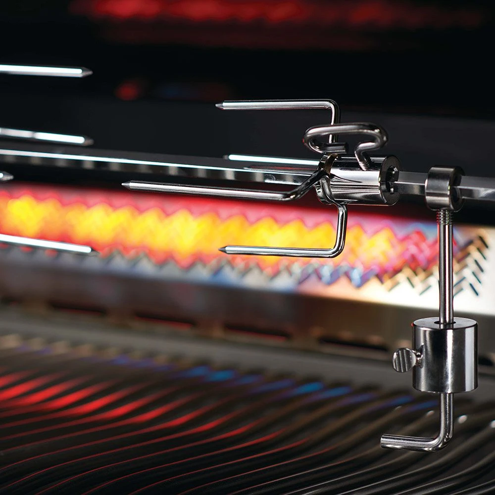 - Rotisserie Burner The rear infrared rotisserie burner is rated for 18,000 BTU to allow professional style rotisserie cooking and elevate the versatility of your Napoleon grill – enjoy the slow, savory flavors of rotisserie style cooking