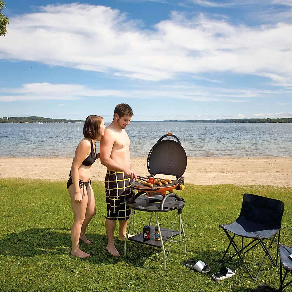 Napoleon TQ2225PO-STAND TravelQ Portable Gas Tabletop Grill with Base, Propane provides a high performance grill for the on-the-go grill enthusiast; it features a large 285 square inches of grilling surface and a 10,500 BTU capability. The durable porcelainized cast iron cooking grid ensures a quality sear while also being capable of enduring travel wear and tear. The TravelQ is the perfect option for camping, boating, RVing or any other activity with limited space?the included ultra-durable TravelQ stand is perfect for tailgates?as it sets up in 10 seconds and uses standard portable propane cylinders.